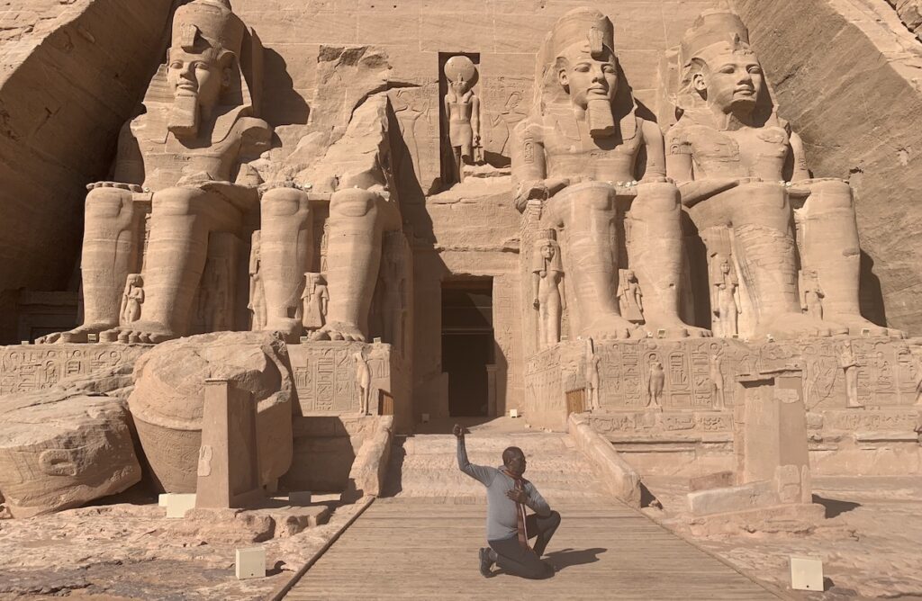 I am performing the Pose of Anpu at the temple commonly called Abu Simbel (not the real name). Should be called Rameses Meri Amun. I find it interesting that there are some folks amongst us who can see obvious images of ancient Kemites performing martial arts maneuvers and readily acknowledge them even though there is no text stating, “we are doing martial arts”.